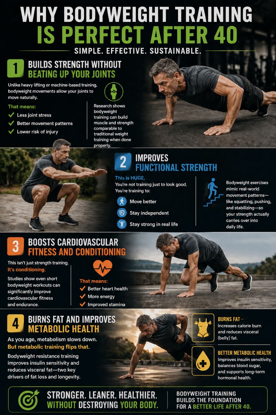 Bodyweight workouts use your own body as resistance, which naturally adapts to your strength, mobility, and structure—making them ideal for men over 40, 50, and 60.