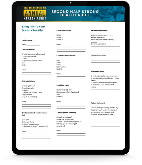 A powerful one-page checklist you can literally bring to your doctor. It outlines the exact tests and screenings men over 40 should request to monitor hormones, metabolic health, cardiovascular risk, and overall longevity.