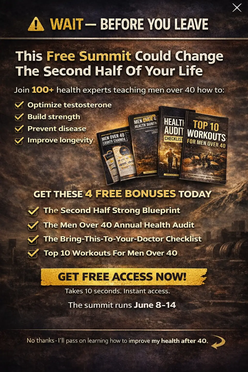 The Men Over 40 Summit is 100% digital, so you don’t have to wait for anything in the mail. You get immediate access to your 4 FREE Gifts and will have access to the Summit talks starting Monday June 8-Sunday June 14, 2026. After signing up you will be directed to upgrade page and then the welcome page to access your resources. Throughout the months leading up to the Summit you will receive accountability emails, tips, strategies, and special offers from Men Over 40 Summit team only. We will not sell or distribute your email to any third party at any time. You may opt out at any time. View our Privacy Policy.